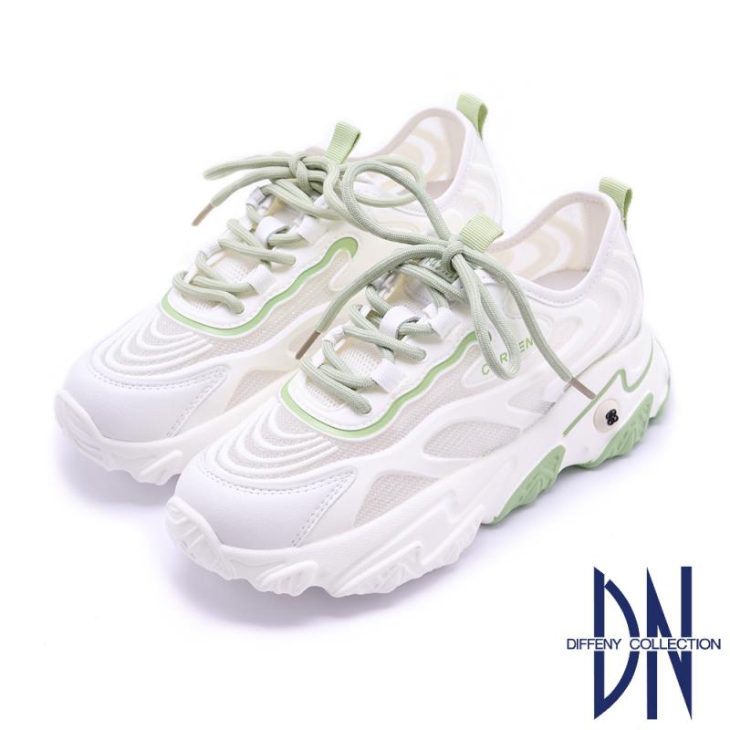 DN老爹鞋_真皮拼接星光網布造型厚底休閒鞋-白綠色